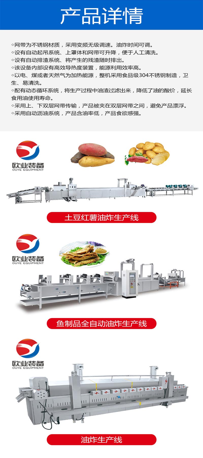特點:◇網帶為不銹鋼材質,采用變頻無級調速。油炸時間可調。◇設有自動起吊系統、上罩體和網帶可升降,便于人工清洗。◇設有自動排渣系統、將產生的殘渣隨時排出。◇該設備內部設有高效導熱度裝置,能源利用效率高。◇以電、煤或者天然氣為加熱能源,整機采用食品級304不銹鋼制造,衛生、易清洗。◇配有動態循環系統,將生產過程中油渣過濾出來,降低了油的酸價,延長食用油使用壽命。◇采用上、下雙層網帶傳輸,產品被夾在雙層網帶之間,避免產品漂浮。◇采用自動瀝油系統,產品含油率低,產品食欲感強。
