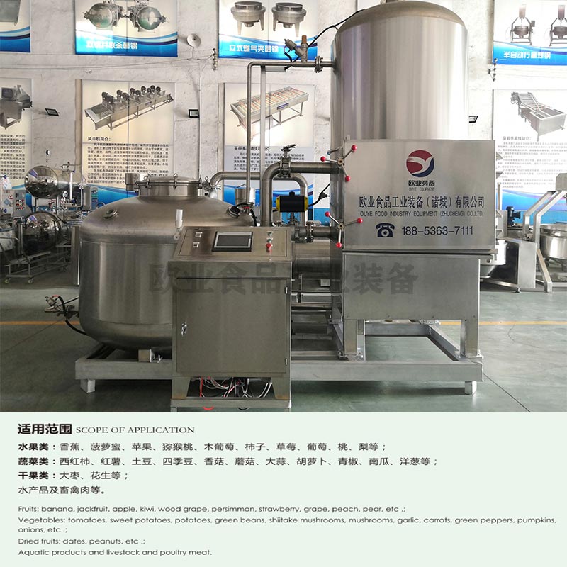 真空低溫油炸設備組成:真空油炸罐、油加熱系統、真空系統、儲油補油系統、氣動系統、自動脫油系統
